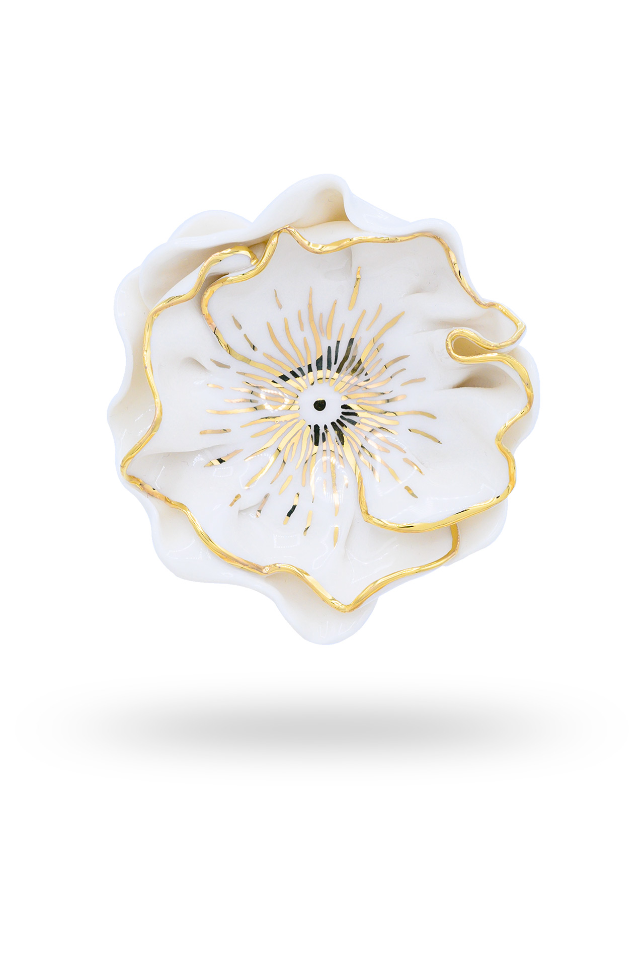 Florale Porzellanbrosche, von Hand bemalt, ein Unikat aus unserem Atelier. Sorgfältig geformt und mit 24-karätigem Gold veredelt, fängt diese elegante Brosche die Zartheit der Natur in einem zeitlosen Accessoire ein – perfekt für feminine und stilvolle Outfits.
