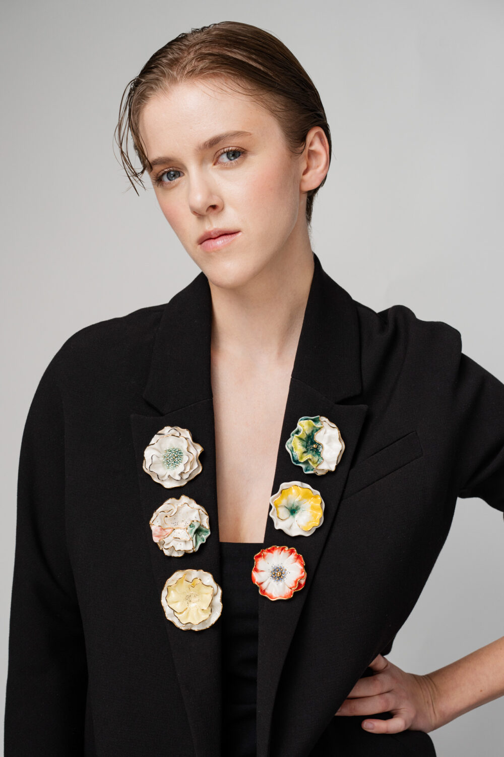 Florale Porzellanbrosche, von Hand bemalt, ein Unikat aus unserem Atelier. Sorgfältig geformt und mit 24-karätigem Gold veredelt, fängt diese elegante Brosche die Zartheit der Natur in einem zeitlosen Accessoire ein – perfekt für feminine und stilvolle Outfits.