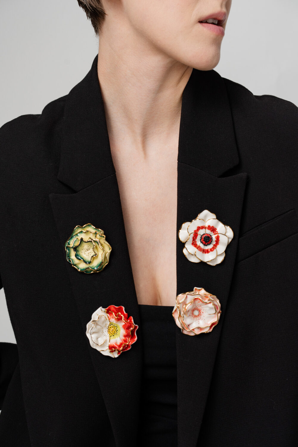 Wie ein Schriftsteller, der mit einer leeren Tafel beginnt, auf die er Worte schreibt, die Sie bewegen, so beginnt auch Diana mit einem leeren Stück Porzellan. Durch verschiedene Techniken wird das Porzellan mühsam in außergewöhnliche, tragbare, einzigartige, handbemalte und mit 24-karätigen Goldbroschen verzierte Unikate verwandelt.