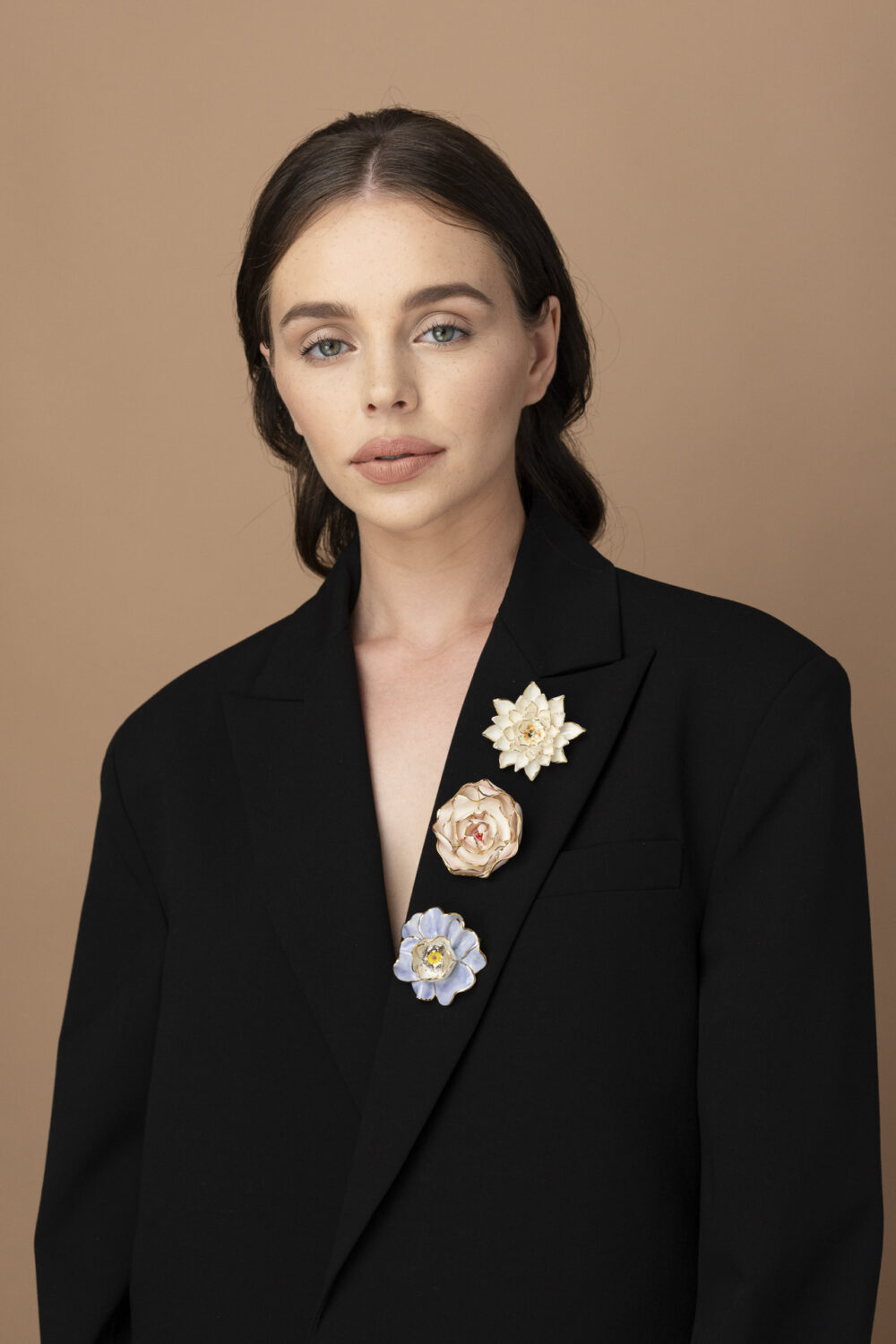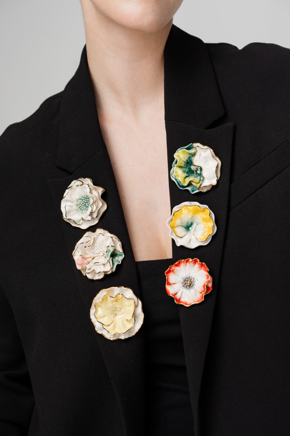 Florale Porzellanbrosche, von Hand bemalt, ein Unikat aus unserem Atelier. Sorgfältig geformt und mit 24-karätigem Gold veredelt, fängt diese elegante Brosche die Zartheit der Natur in einem zeitlosen Accessoire ein – perfekt für feminine und stilvolle Outfits.