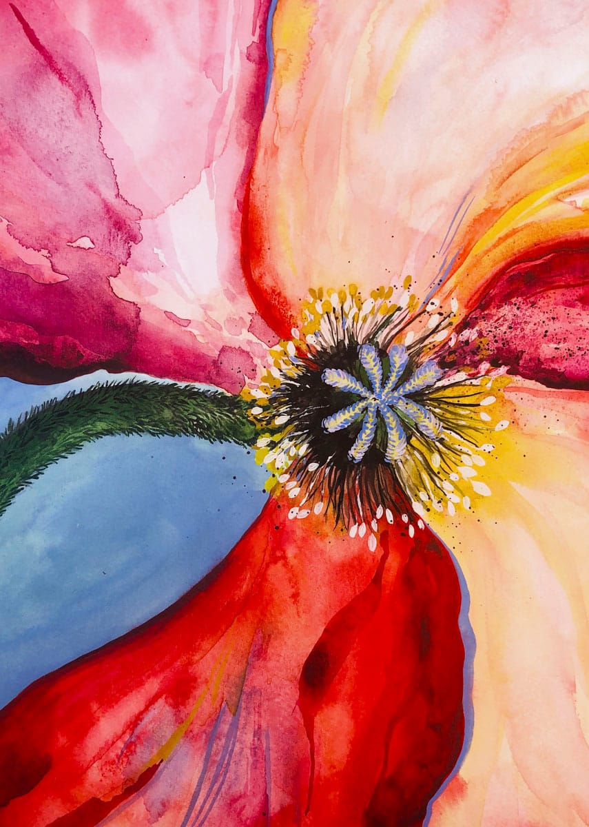 Aquarelltechnik auf dickem 300g/m2 kaltgepresstem Papier. 29,7 x 42 cm.